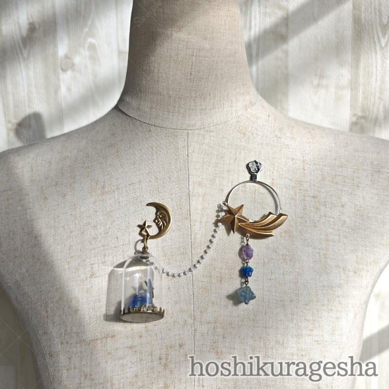 月と星、ふたつのピンブローチがチェーンでつながれ一組となっているブローチ。