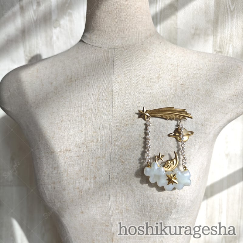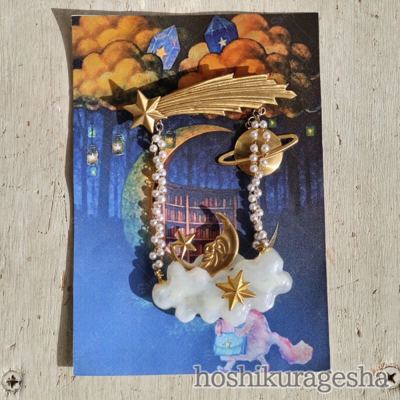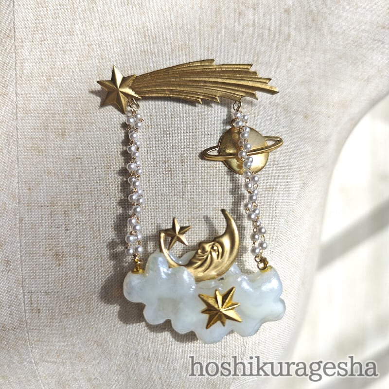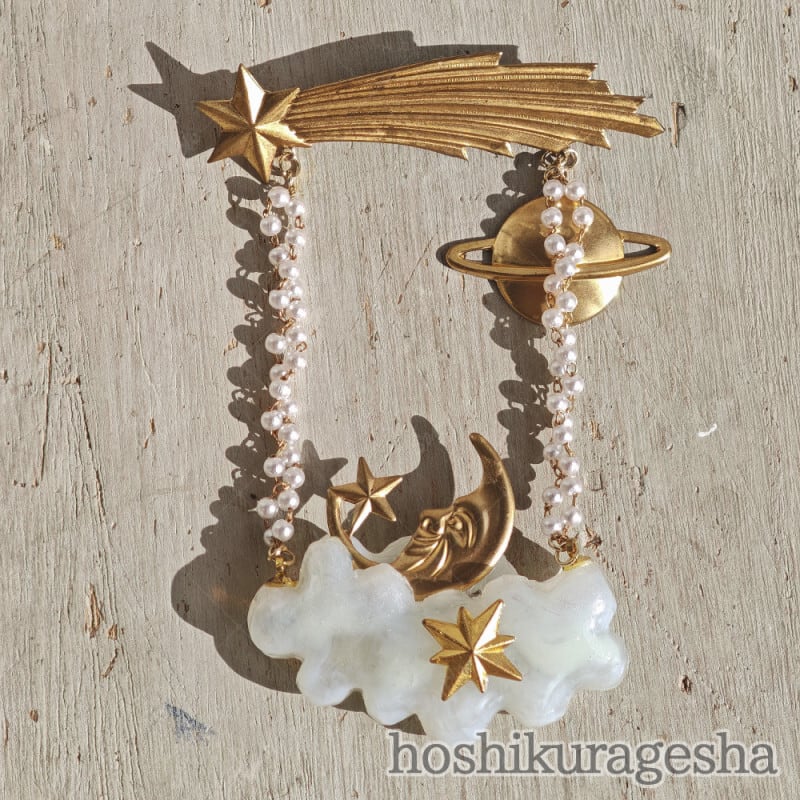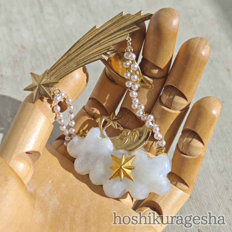 月、星、流星、土星に雲と、魅力的なモチーフとパールチェーンの組み合わせがロマンチック。