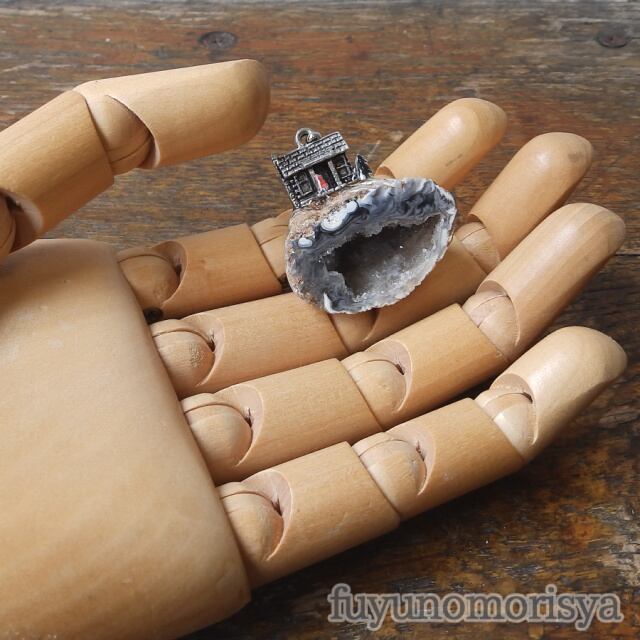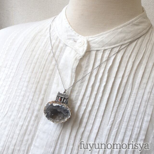 素材:めのう晶洞(ブラジル産)・真鍮(小屋)・紙(防水加工)・真鍮+純ロジウムコーティング(チェーンと金具)