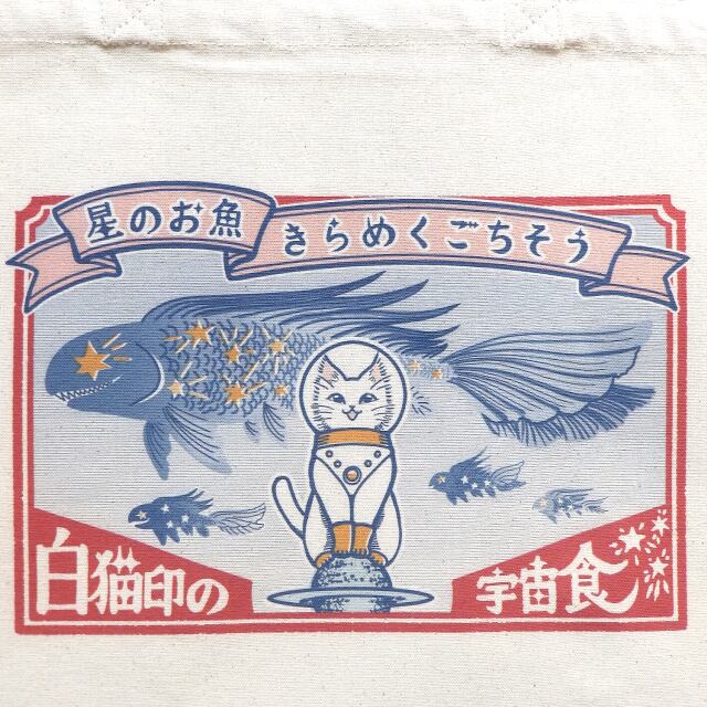 キャンバストートバッグLサイズ - 白猫印の宇宙食 おさかな味 - 金星灯百貨店