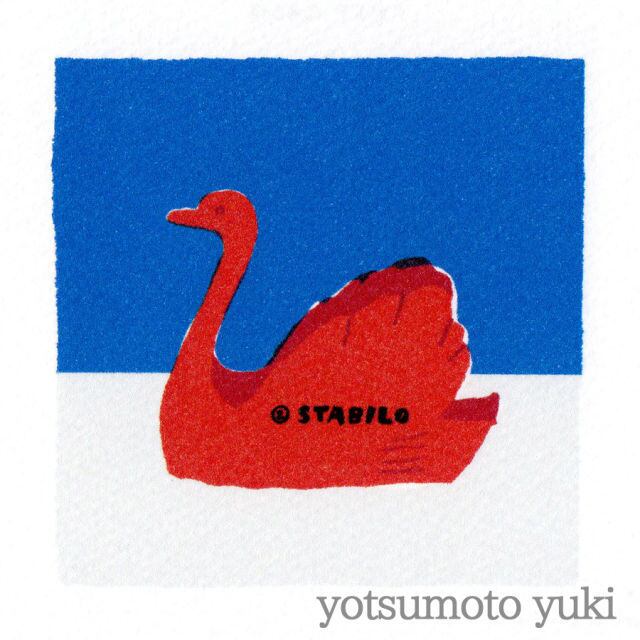 赤いスワンに、鮮やかなブルーと薄いグレーの背景が印象的。
